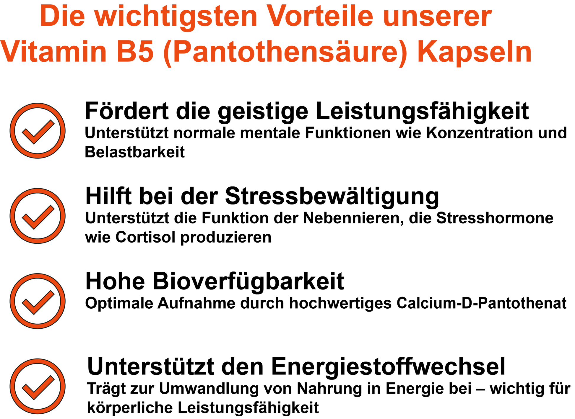 Unsere Vitamin B5 (Pantothensäure) Kapseln tragen zu einem normalen Energiestoffwechsel bei und unterstützen eine normale geistige Leistung.