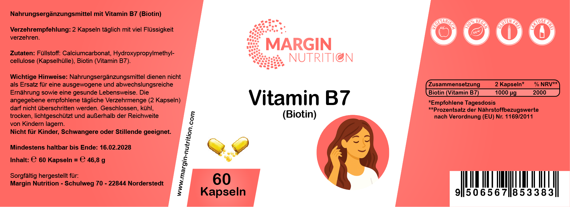 Enthalten ist reines Biotin (Vitamin B7), das als wasserlösliches Vitamin gut vom Körper aufgenommen wird und eine hohe Bioverfügbarkeit besitzt.