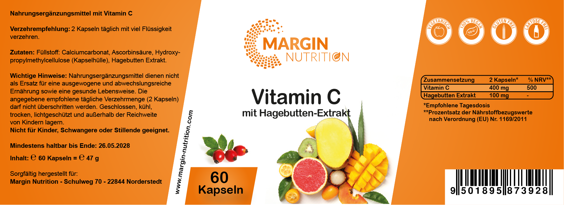 Vitamin C mit Hagebutten-Extrakt – Mit 400 mg Vitamin C und 100 mg Hagebutten-Extrakt pro Tagesdosis | 30, 60, 2×60, 3×60 vegane Kapseln