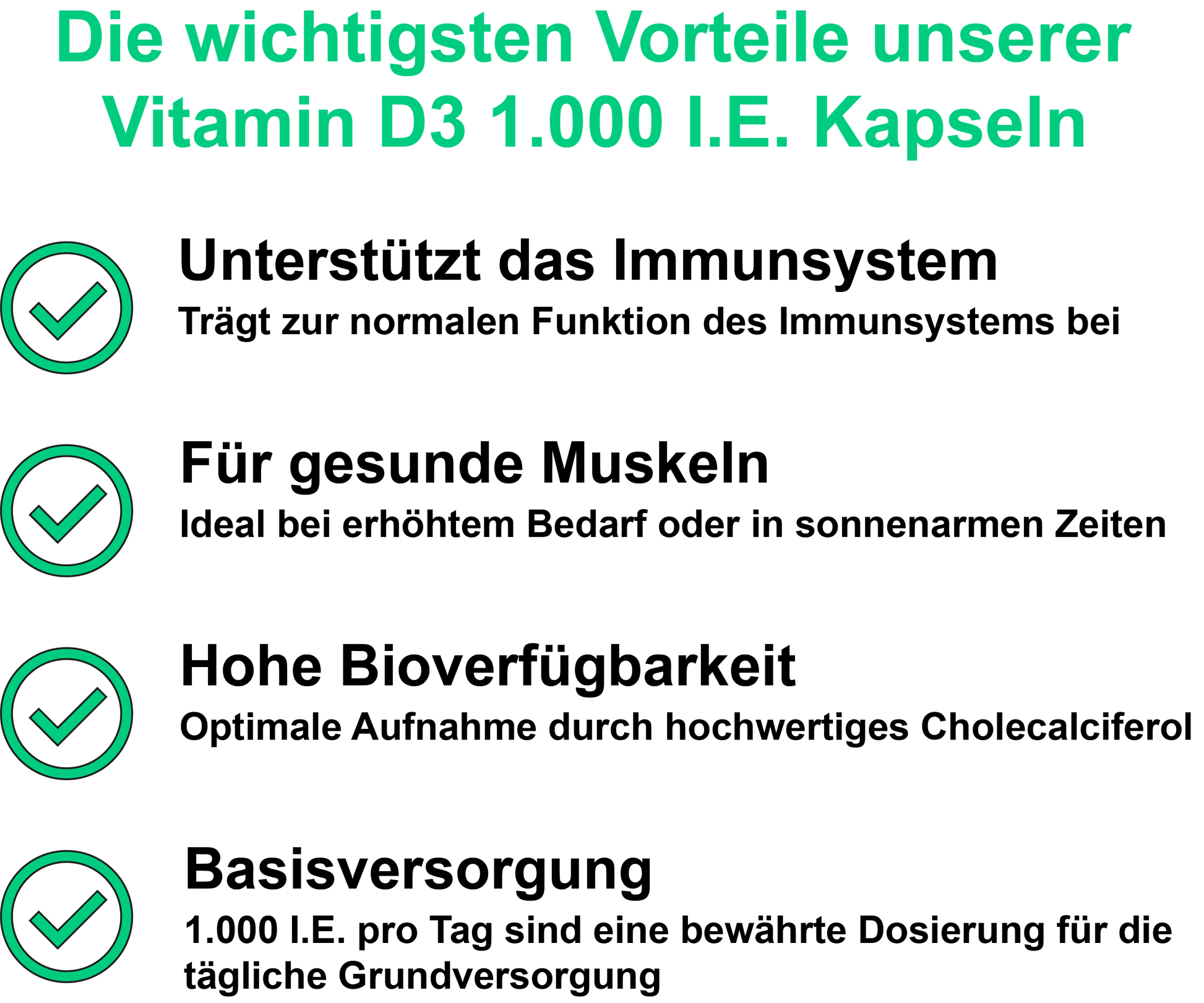 Die Angabe 1000 I.E. (Internationale Einheiten) entspricht 25 µg Vitamin D3 pro Tagesdosis. Das ist eine moderate Menge, die speziell für die tägliche Basisversorgung entwickelt wurde.