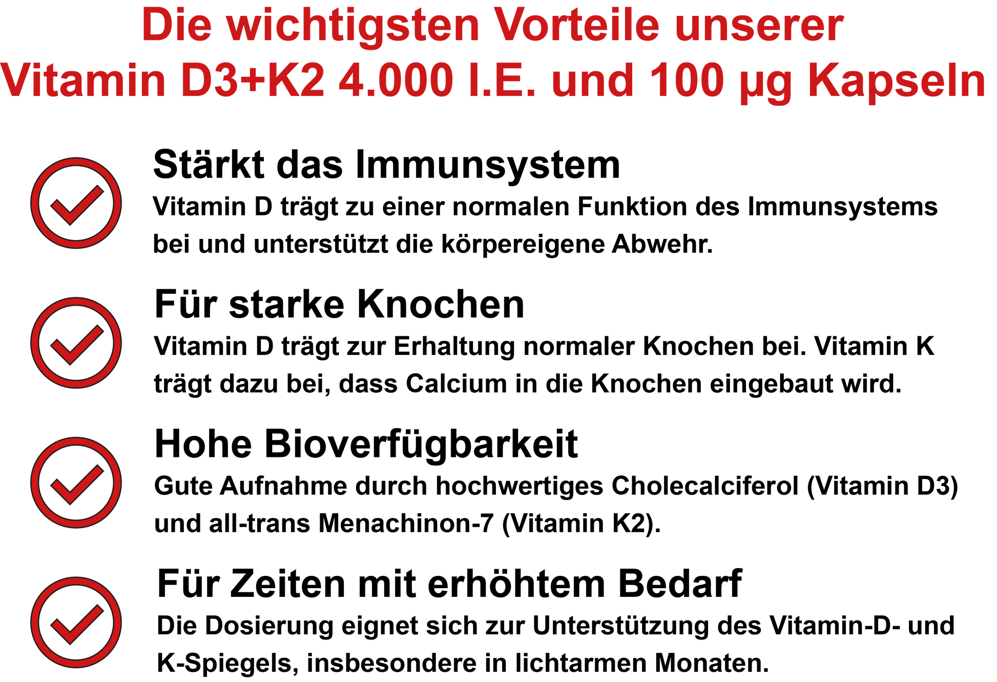 Bei der Entwicklung unseres Vitamin D3+K2 MK-7 Präparats mit 4.000 I.E. Vitamin D3 und 100 µg Vitamin K2 MK-7 pro Tagesdosis haben wir uns für eine Dosierung entschieden, die eine sinnvolle Ergänzung der täglichen Versorgung ermöglicht. Die Kombination basiert auf aktuellen ernährungswissenschaftlichen Erkenntnissen und wurde so gewählt, dass sie eine ausgewogene Basisversorgung unterstützt.
