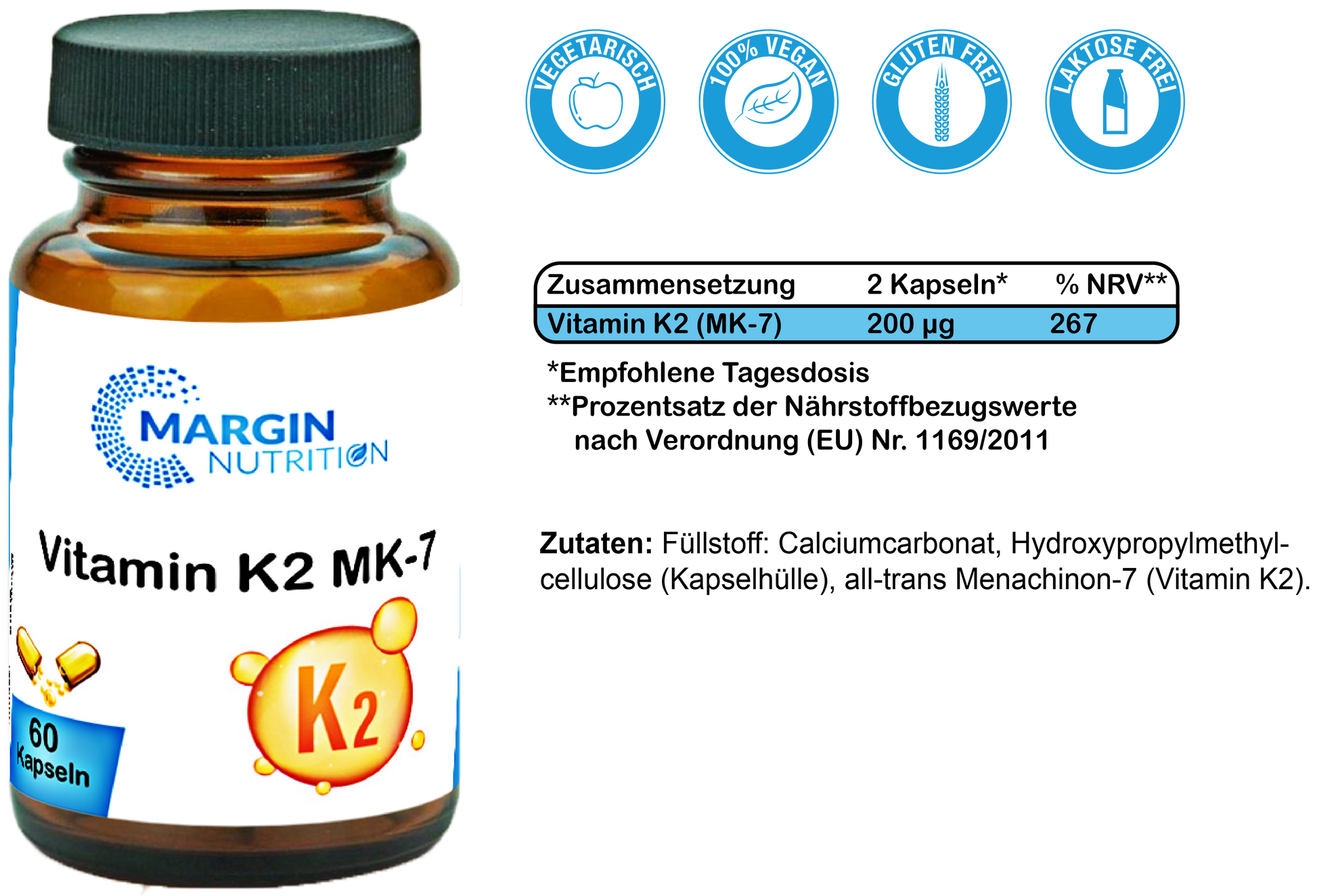 Füllstoff: Calciumcarbonat, Hydroxypropylmethylcellulose (Kapselhülle), all-Trans Menachinon-7 (Vitamin K2).Verzehrempfehlung: