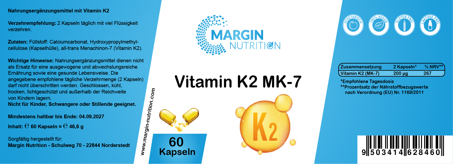 Vitamin K2 MK-7 – Hochdosiert 200 µg pro Tagesdosis | 30, 60, 2×60, 3×60 vegane Kapseln
