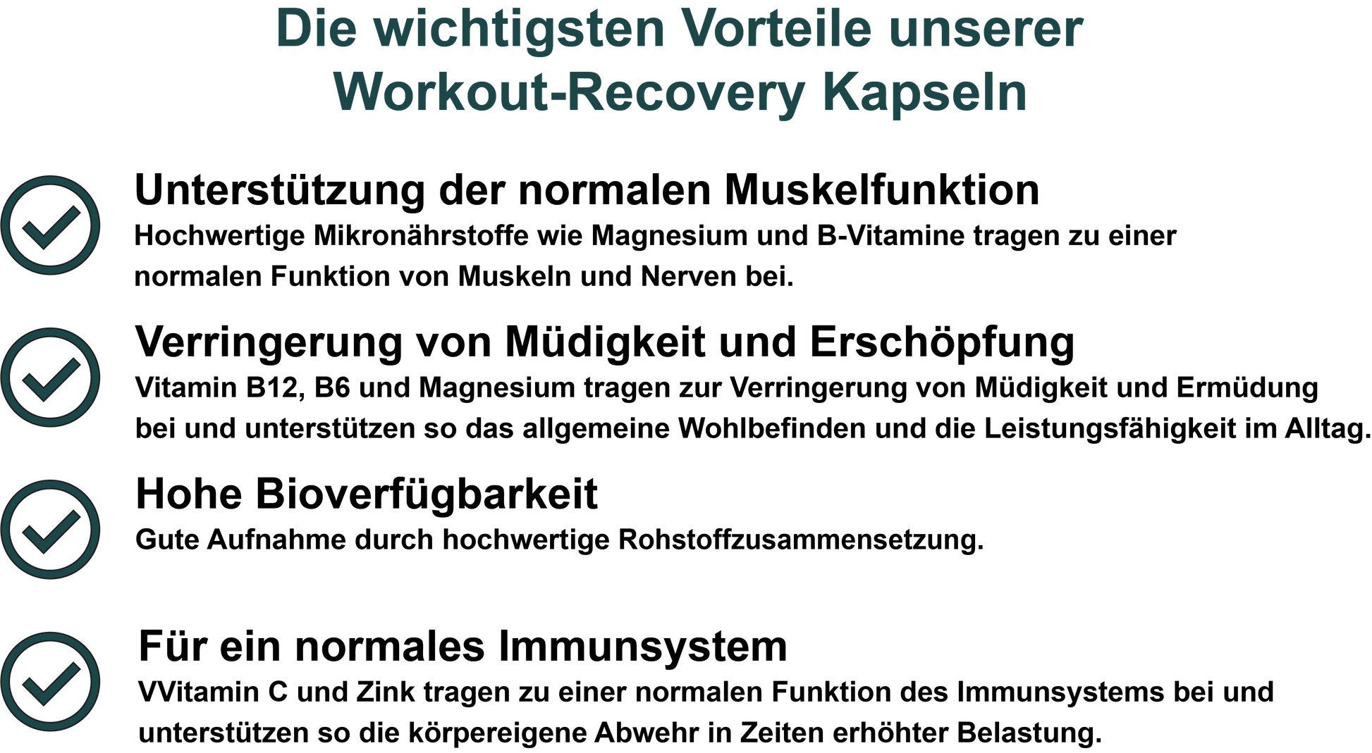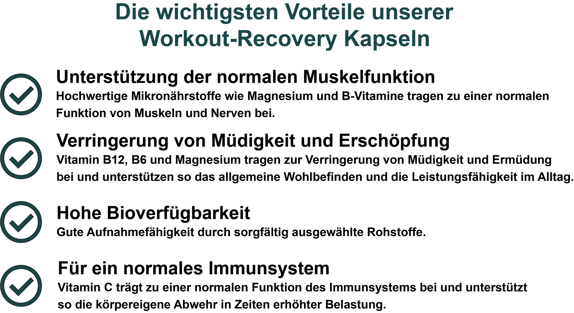 Bei der Entwicklung unserer Workout-Recovery Kapseln mit 160 mg Vitamin C, 150 mg Magnesium, 250 mg MSM, 150 mg Traubenkernextrakt (davon 60 mg OPC) sowie einem ausgewogenen Komplex aus allen 8 B-Vitaminen haben wir uns bewusst für eine durchdachte Formulierung entschieden, die den Anforderungen nach sportlicher Belastung gerecht wird. Die Dosierung basiert auf aktuellen ernährungswissenschaftlichen Erkenntnissen und wurde so gewählt, dass sie einen Beitrag zur normalen Muskelfunktion, zum Energiestoffwechsel sowie zum Schutz der Zellen vor oxidativem Stress leisten kann.