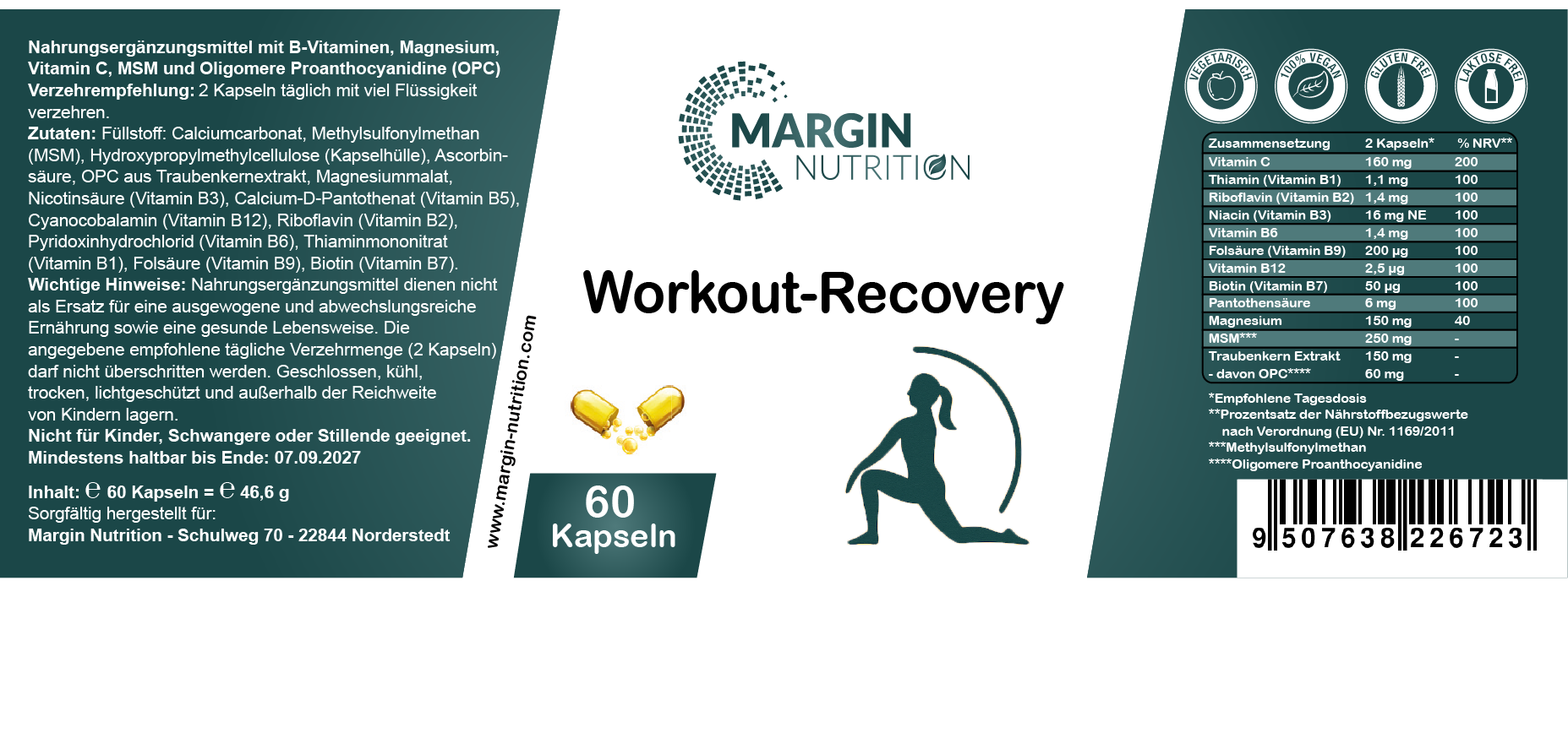Workout-Recovery / Mit allen 8 B-Vitaminen, Magnesium, Vitamin C, MSM und Oligomere Proanthocyanidine (OPC) (30, 60, 2x60, 3x60 Vegane Kapseln)