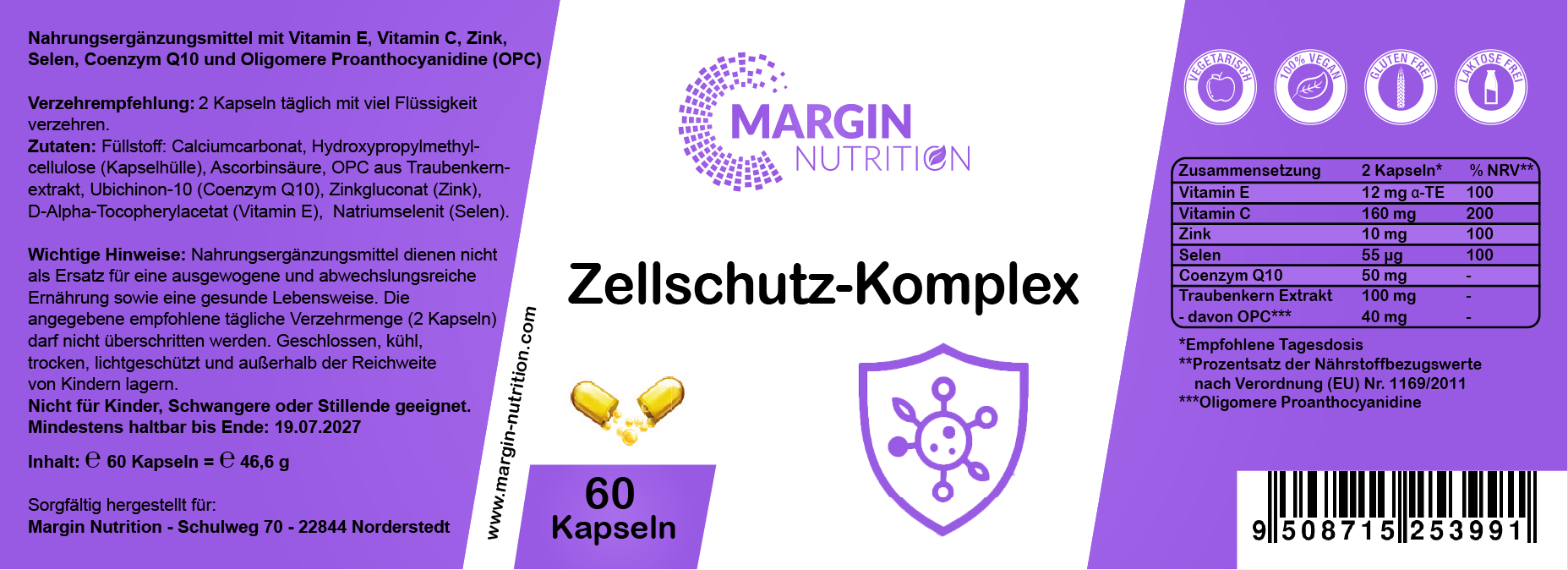 Füllstoff: Calciumcarbonat, Hydroxypropylmethylcellulose (Kapselhülle), Ascorbinsäure, OPC aus Traubenkernextrakt, Ubichinon-10 (Coenzym Q10), Zinkgluconat (Zink), D-Alpha-Tocopherylacetat (Vitamin E), Natriumselenit (Selen).Verzehrempfehlung: