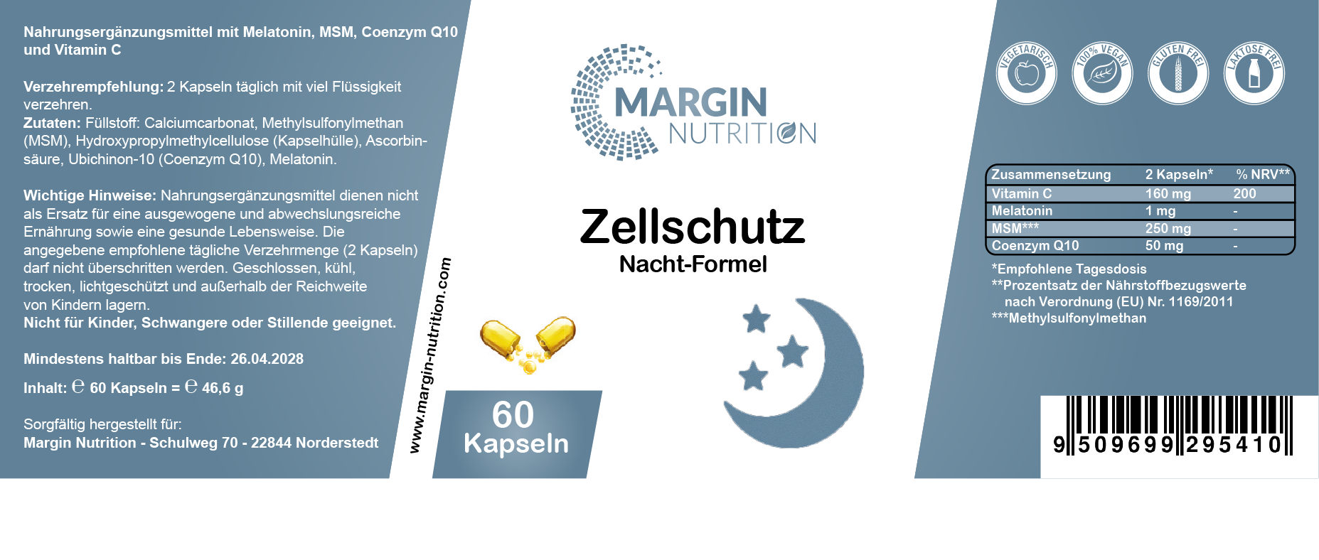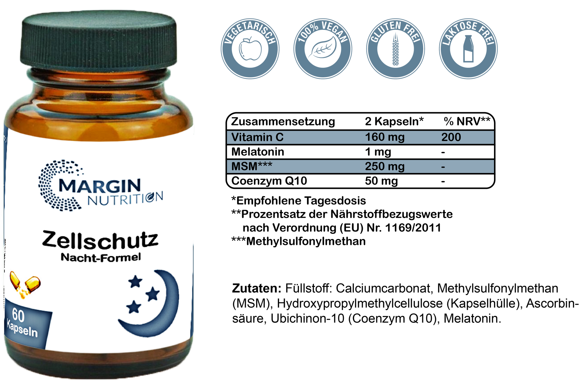 Zellschutz Nacht-Formel / Mit Melatonin, MSM, Coenzym Q10 und Vitamin C (30, 60, 2x60, 3x60 Vegane Kapseln)